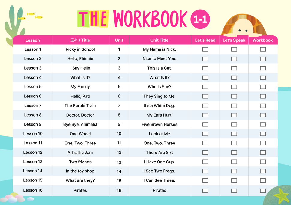 필수 다운 자료학습 진도표Stage 1 ~ Stage 6 전체 학습 진도표입니다.Let's Read, Let's Speak, Workbook 의 완료 여부를 체크할 수 있습니다. 학습진도표.zip17.6MB