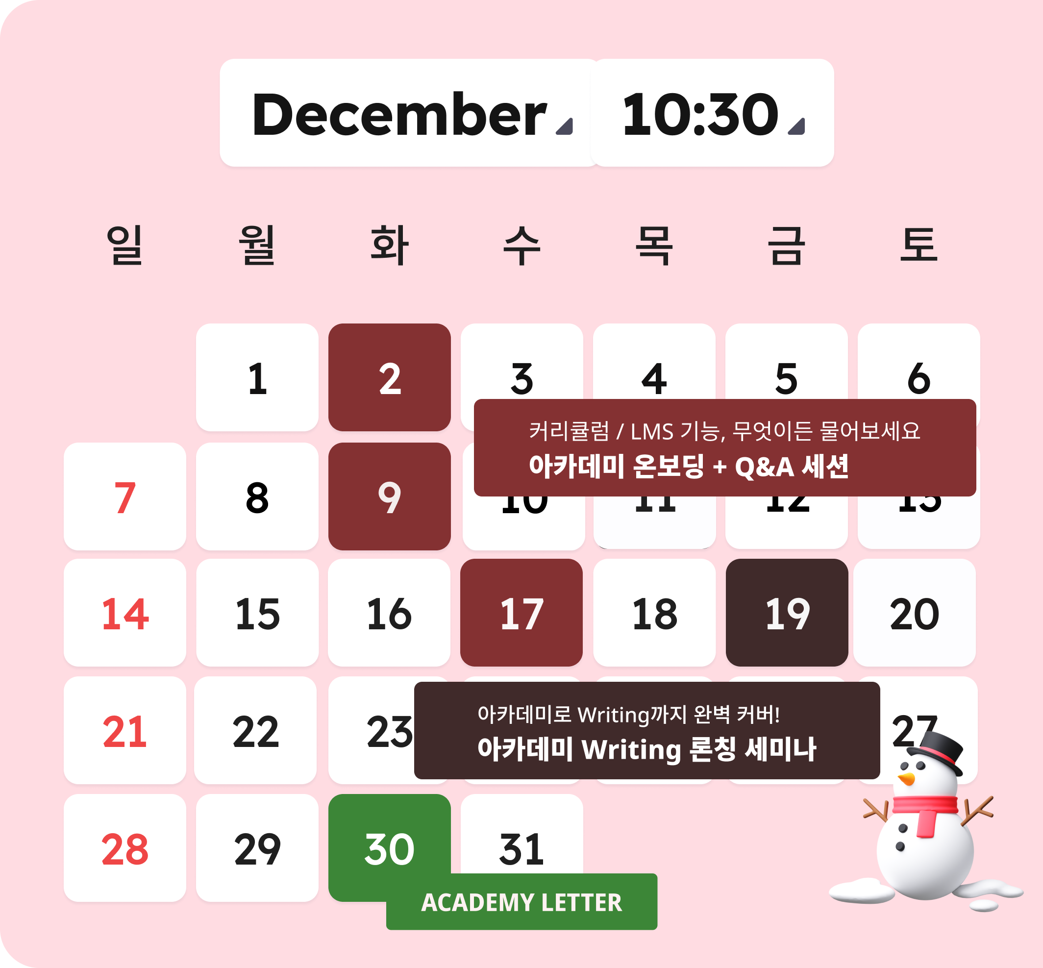 이번 달, 특별한 아카데미만의 Writing 서비스가 론칭됩니다. 19일 자세하게 안내드릴 테니, 당일 꼭 세미나에 참여해 주세요!