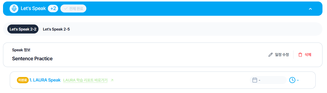 ② Let’s Speak : Shows the type of activity (Sentence Practice / Review Quiz / Roleplay), LAURA report, schedule, and study time.
