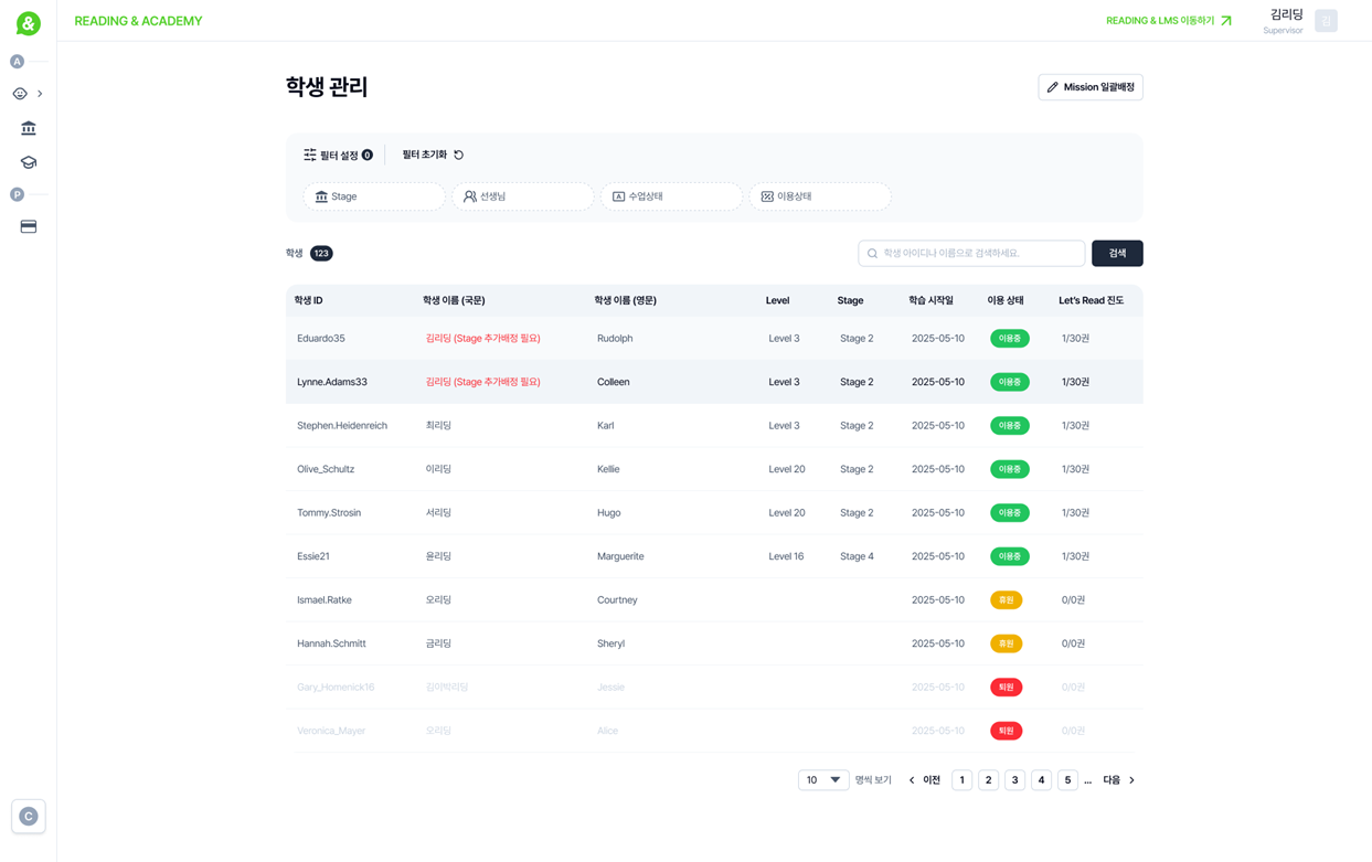 리딩앤 아카데미 LMS 좌측 메뉴의 **‘학생’-’학생 관리’**를 클릭하면, 현재 이용중인 학생을 포함해 아카데미 등록(Stage 배정) 이력이 있는 학생 리스트를 확인할 수 있습니다.