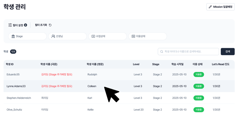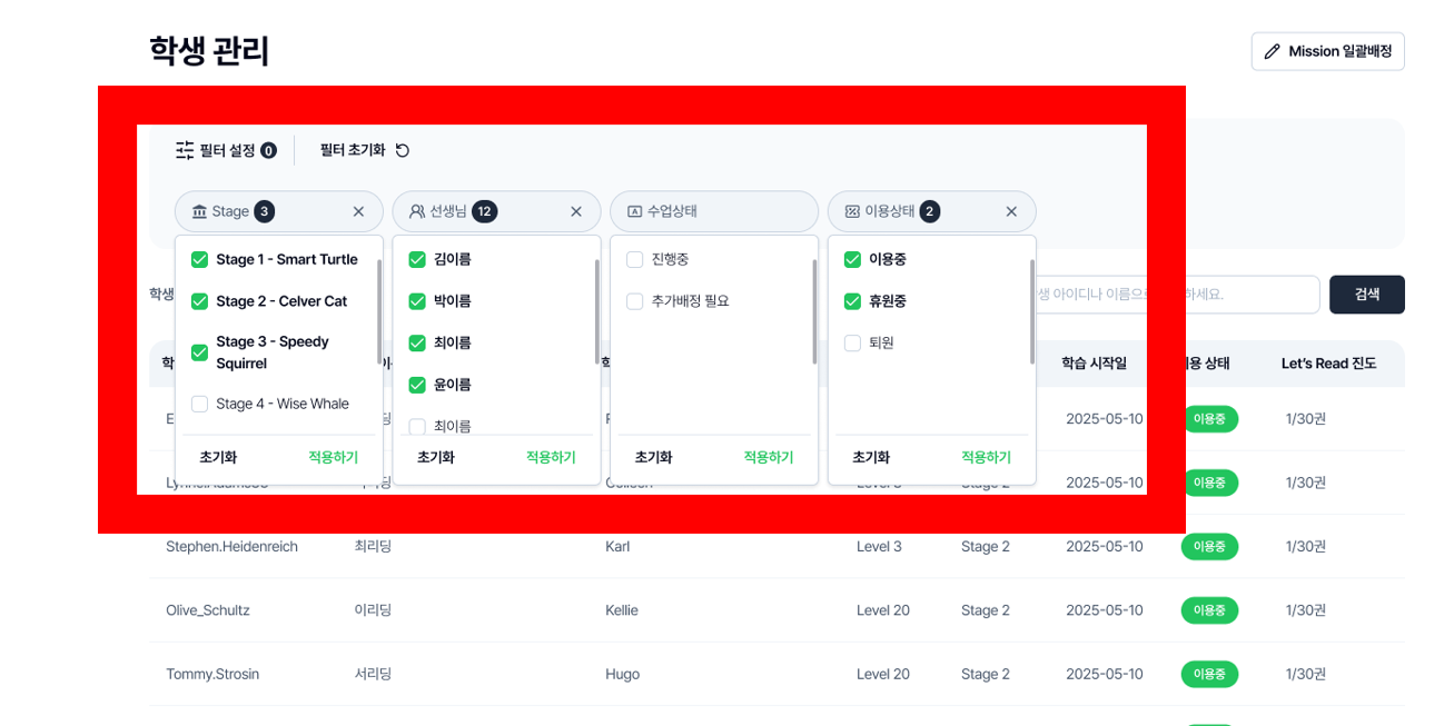‘필터 설정’에서, Stage / 선생님 / 수업 상태 / 이용 상태별로 필터링하여 조회해 보세요.
