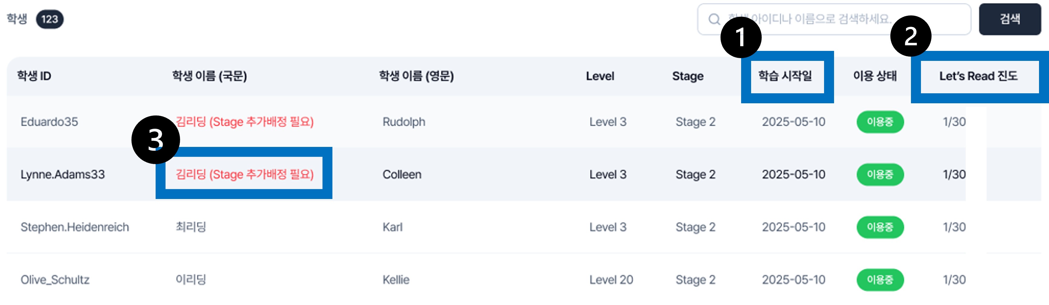배정된 스테이지의 레슨 시작 일자가 표시됩니다. 세 번째 줄의 최리딩 학생은, Stage 2의 레슨 시작일자가 2025년 5월 10일입니다.