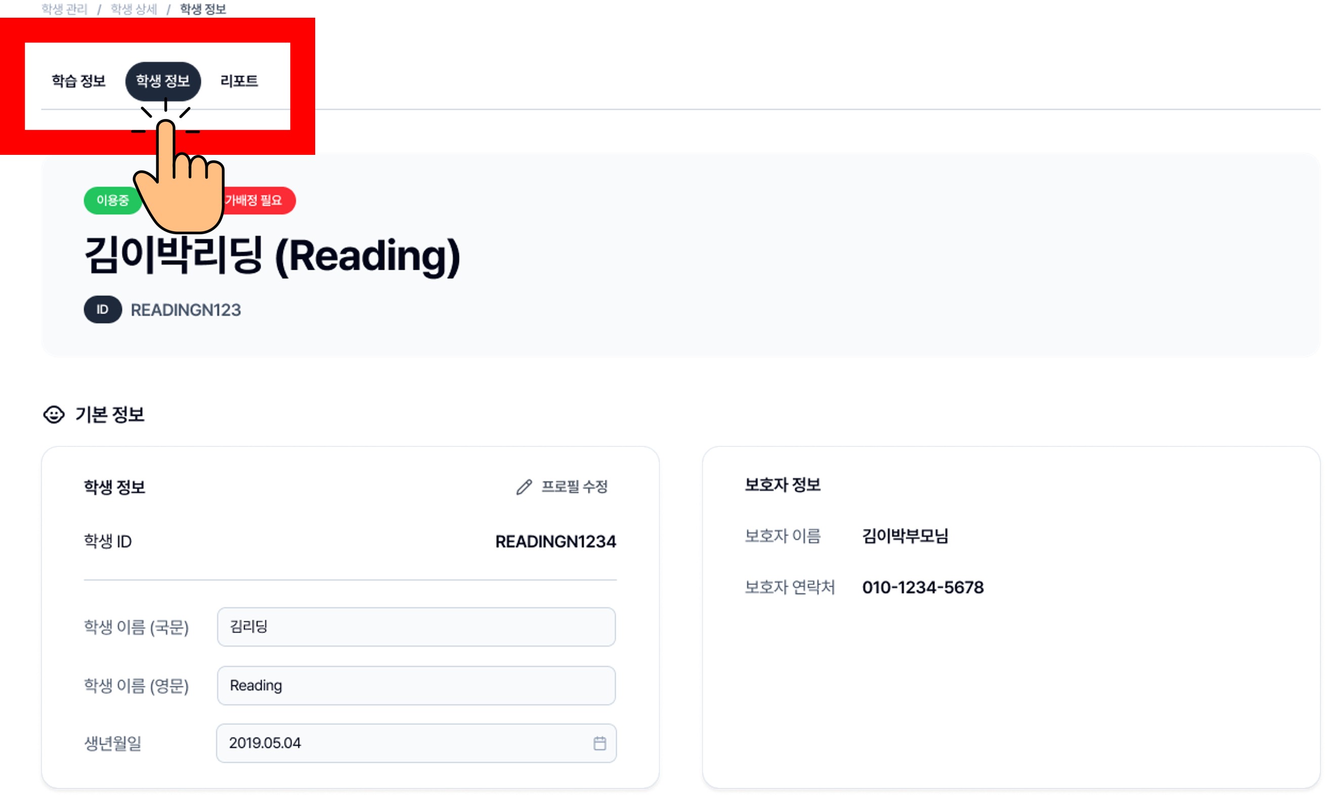 a. ‘기본 정보’에서는 학생의 이름 및 생년월일 등 프로필 정보를 수정할 수 있습니다.