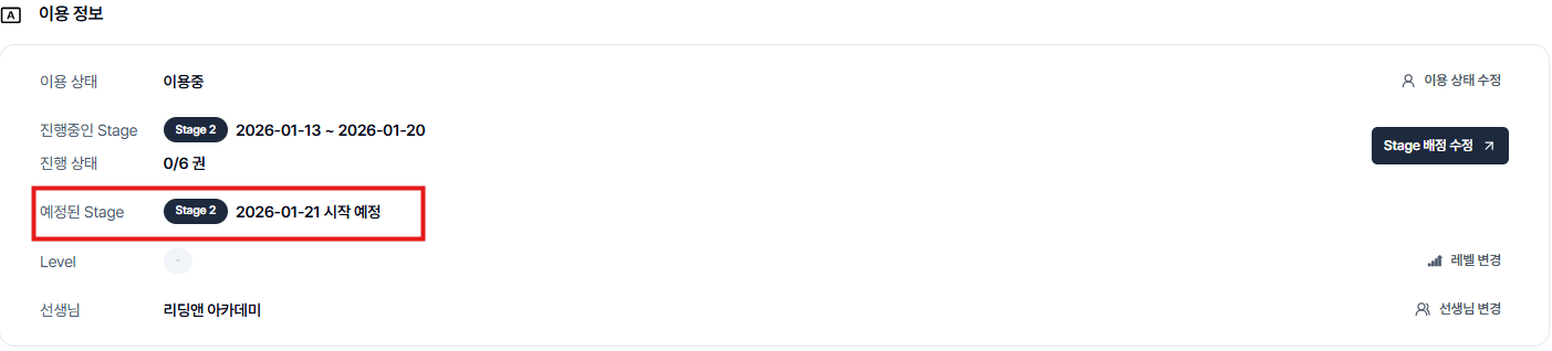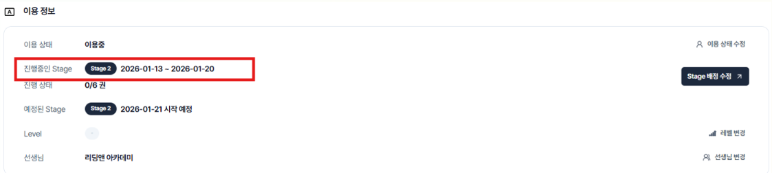 b. ‘이용 정보’에서는 Stage, 레벨, 선생님, 이용 상태를 변경할 수 있습니다.
