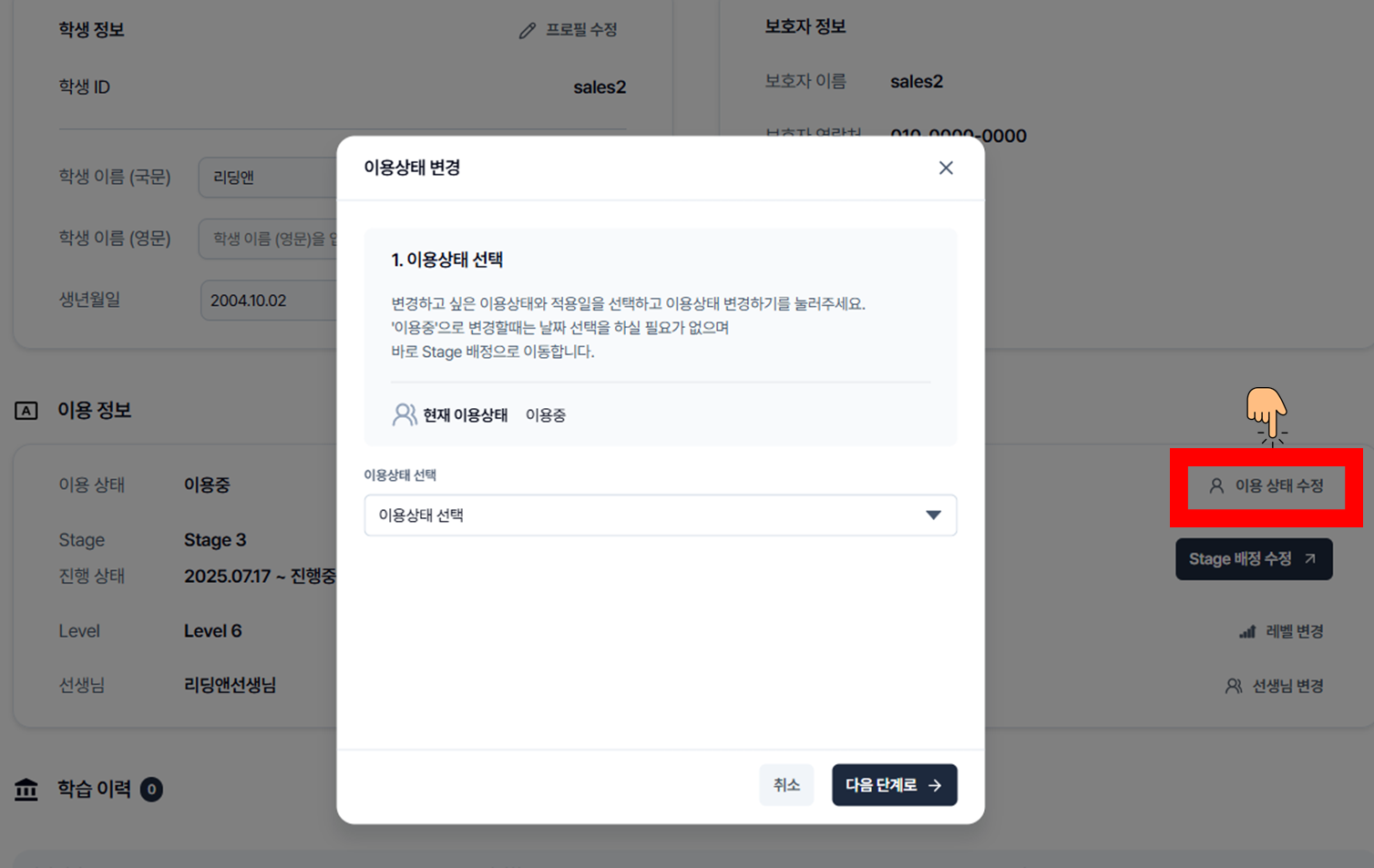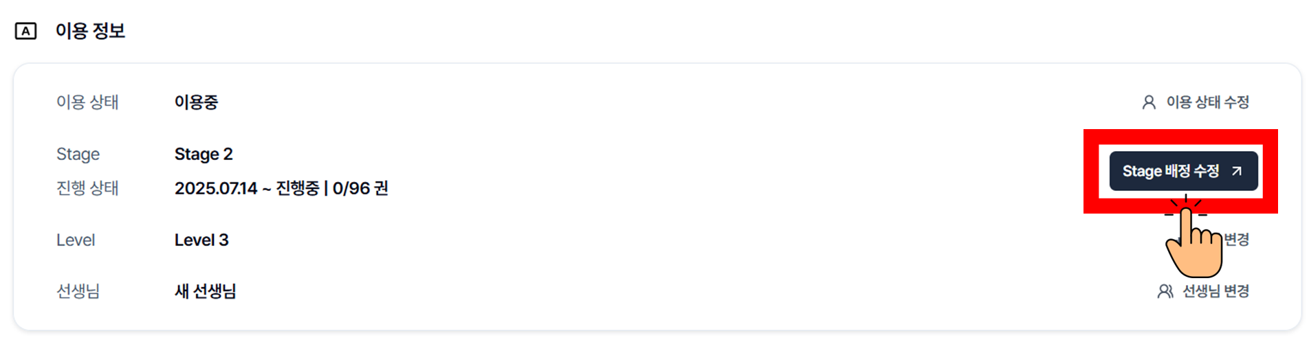 b. ‘이용 정보’에서는 Stage, 레벨, 선생님, 이용 상태를 변경할 수 있습니다.