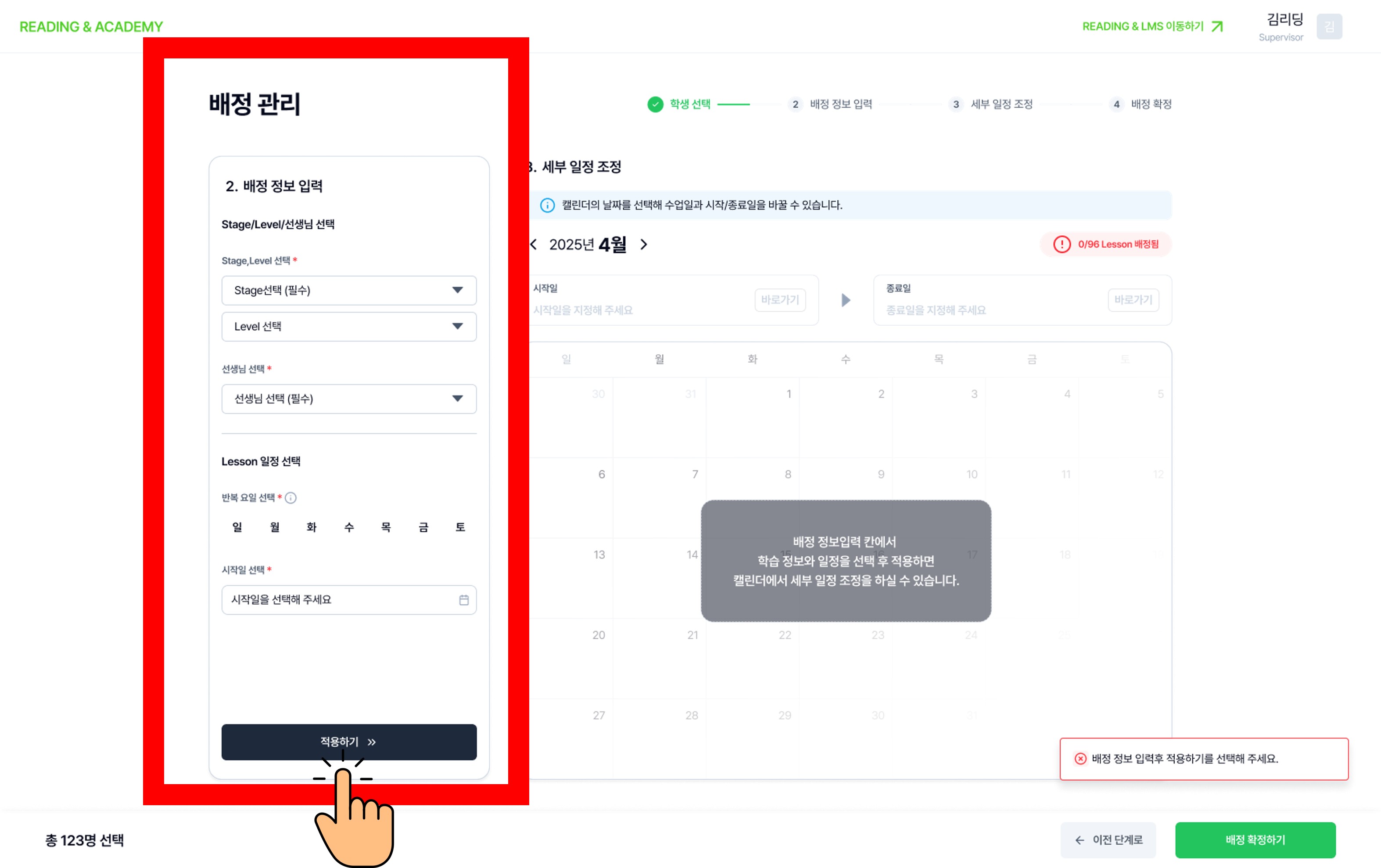 โถ Choose the Stage (+Level), Teacher, and Lesson schedule.