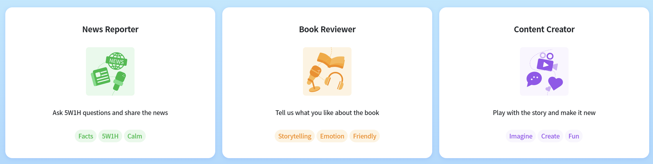 뉴스 리포터 / 북 리뷰어 / 콘텐츠 크리에이터 중 하나의 역할을 선택하고